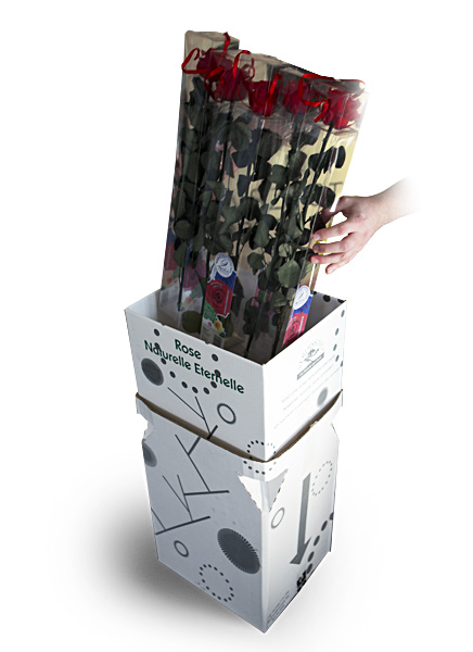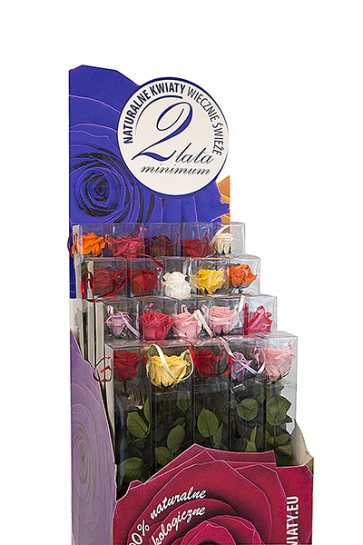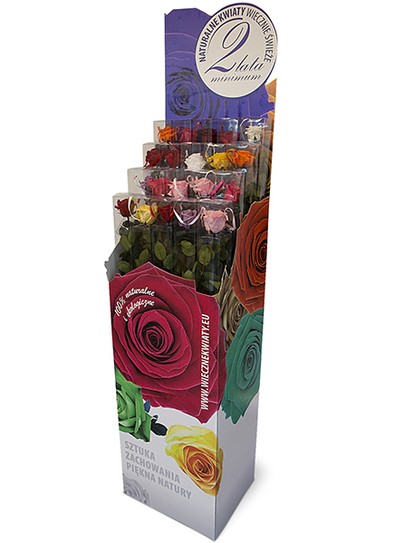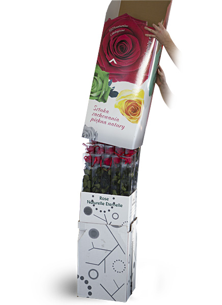 Dedykowany stojak kartonowy na róże. Sprytne rozwiązanie pozwalające wykorzystać pudło w którym transportowane są róże. Wspaniałe produkty pochodzą od firmy: D.J.W.Everlasting Flowers Damian Wolski Spółka komandytowa Zapraszamy do odwiedzenia strony. Polecamy przepiękne róże.