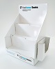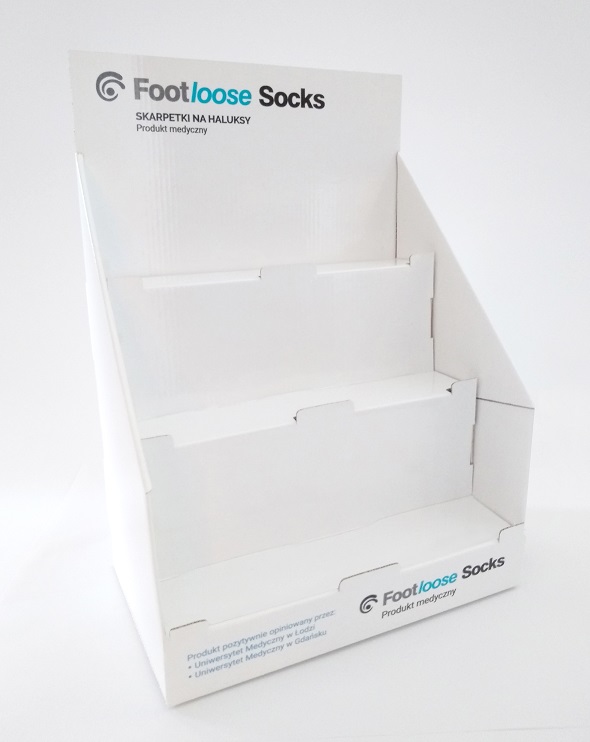 Stylowy ekspozytor z przeznaczeniem do sklepów medycznych i aptek. Ekspozycja produktu na trzystopniowej kaskadzie. Wykonany jest w całości z tektury falistej, bielonej, laminowanej folią z połyskiem. Toper i podest zadrukowane wg. wzoru. Kolorystyka ekspozytora nawiązuje do wyrobów medycznych i stanowi subtelne tło dla eksponowanego produktu.